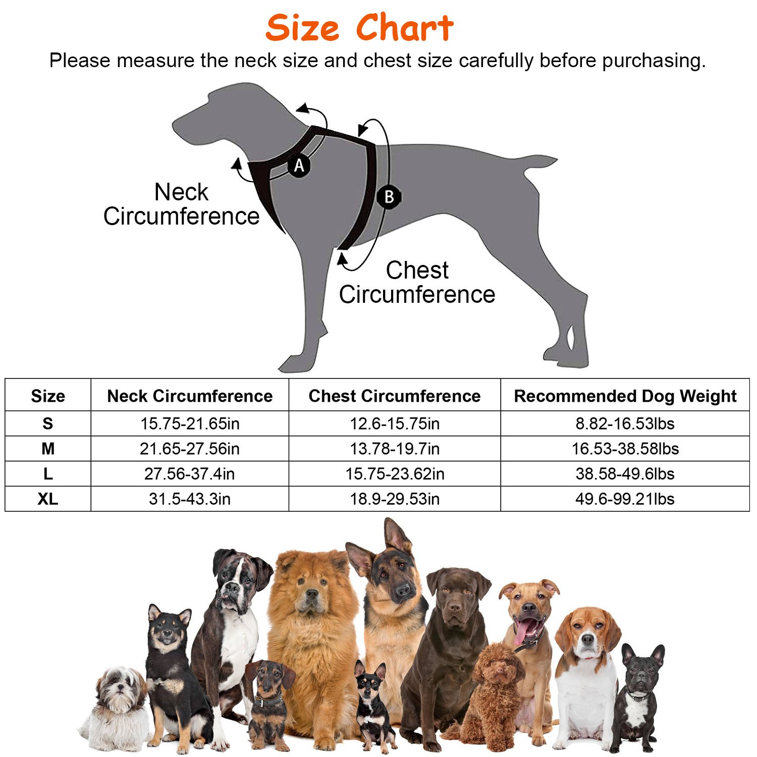Chest Circumference: S: 32-40cm/12.6-15.75in; M: 35-50cm/13.78-19.7in; L: 40-60cm/15.75-23.62in; XL: 48-75cm/18.9-29.53in